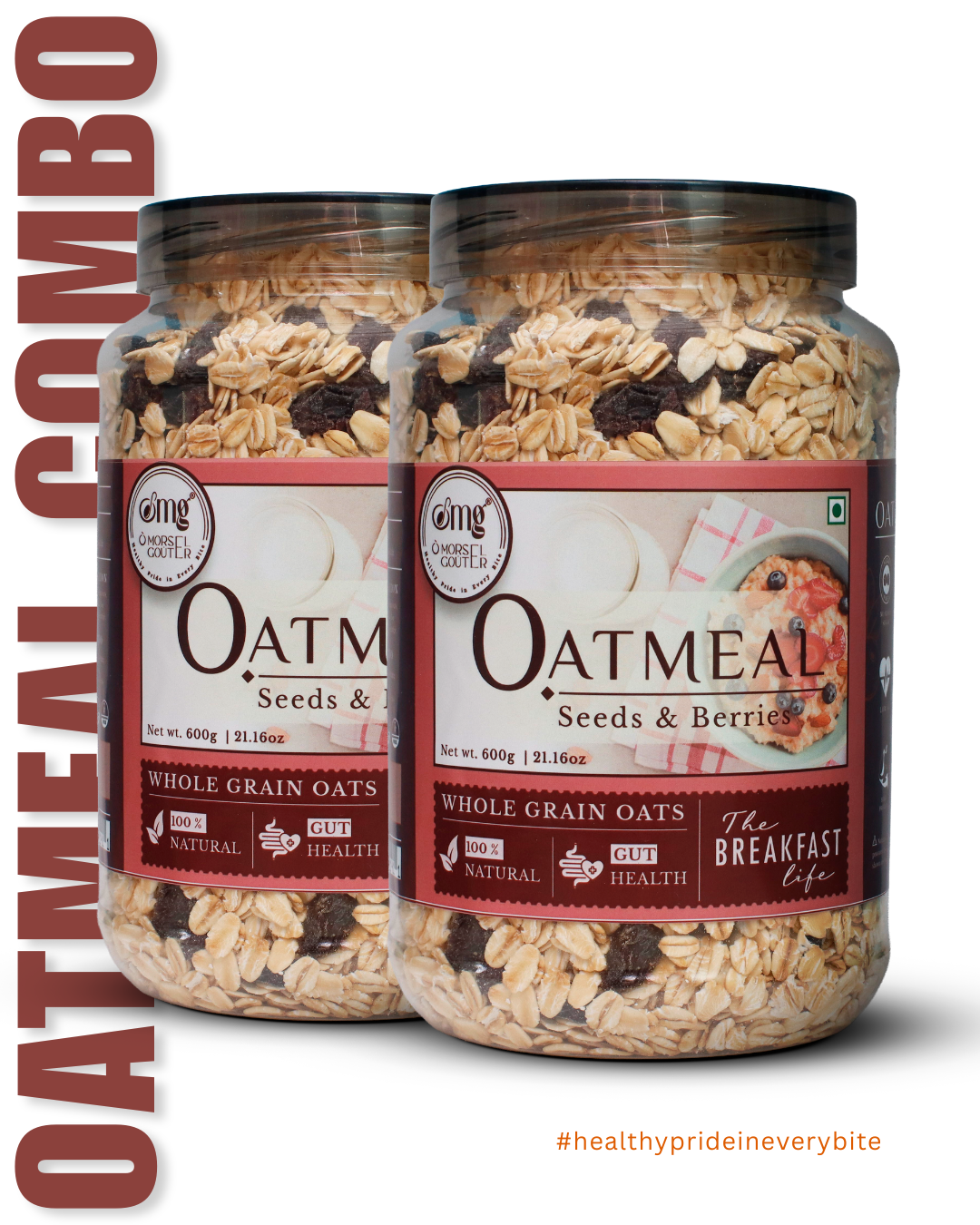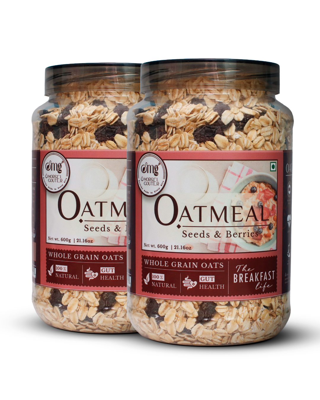 Introducing our signature oatmeal blend- crafted with the goodness of rolled oats, a delightful blend of dried berries (cranberries, raspberries, golden berries, black currants, strawberries), and super seeds (chia, pumpkin, sunflower).