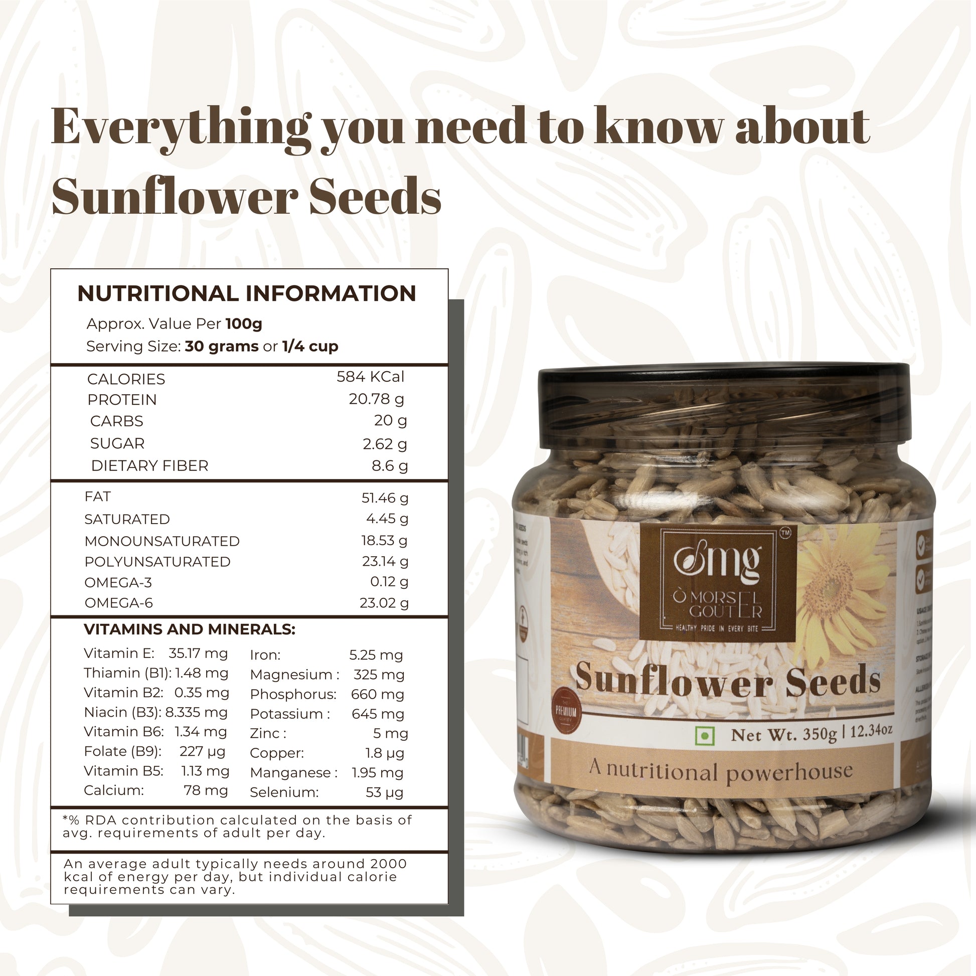 Discover the wholesome goodness of our sunflower seeds. Packed with protein, fiber and essential nutrients, they're the perfect snack to fuel your day.